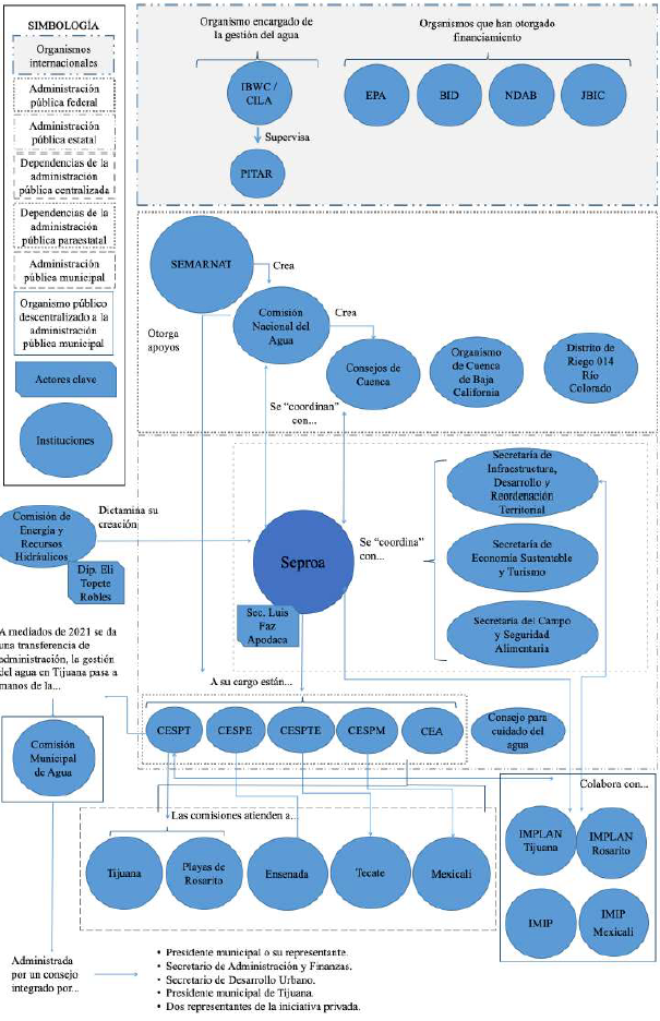 Cabe destacar que la temporalidad del análisis abarca los últimos tres lustros de la gestión de agua urbana en Baja California (2007-2022), por considerar oportuno el análisis de un momento de cambio institucional. En este sentido, se analizan las formas de organización antes y después de la creación de la Secretaría de Manejo, Protección y Saneamiento de Agua (Seproa) con la finalidad de conocer sus líneas de acción e identificar las continuidades y/o tensiones en torno a las políticas de desarrollo hídrico.