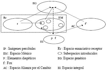 El espacio de entrada M3J corresponde a la diégesis del texto, el futuro "México 3 de julio". El espacio de entrada EP corresponde, a su vez, a la dimension enunciativa del texto: el momento de la recepción del mensaje. Se trata, pues, de un espacio mental del "presente". Gracias a las miradas en yotú y los planos en close up, los elementos de estas dos entidades mentales los personajes en pantalla por un lado y la entidad Rr por el otro, son proyectados hacia el espacio integral (EI), donde comparten un mismo espacio mental, produciendo la impresión de que son accesibles unos a otros. De esta manera el "futuro" y el "presente" resultan por algunos instantes conectados: