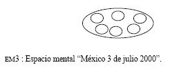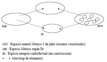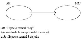 Operando esta función, el texto invita a los participantes a construir el espacio mental "hoy" (AH), el cual será inversamente proporcional al espacio mental "México 3 de julio". En términos de integración conceptual este proceso puede ser modelizado de la siguiente manera: