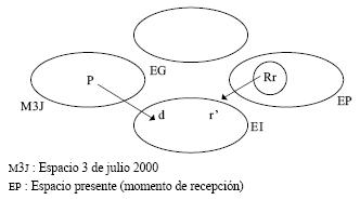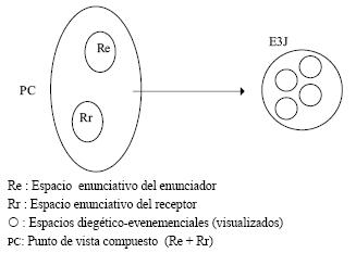 Esta modelización indica que los espacios evenemenciales introducidos por las escenas (y componentes del espacio M3 J, son "puestas en focus" a partir de un "punto de vista" cognitivo compuesto (PC) tanto del enunciatario (Rr, receptor), como del enunciador jamás visualizado del mensaje (Re) (p. ej.: camarógrafo, productor del mensaje, Partido AC., etcétera).26