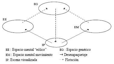 En esta integración cognitiva, la imagen percibida (esta vez en el blend IP) permite el desempaquetaje de los espacios eólico (EE) por un lado y movimiento del otro (EM). La estructura de estos espacios (de orden mayoritariamente sensorial) flota enseguida hacia el espacio integral, que se ocupará de despejar un frame de orden secundario concerniente precisamente a la sensación de liberación corporal33, pero también un frame terciario compuesto: "el viento que permite la liberación y el movimiento".