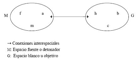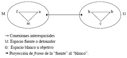 Pero este fenómeno es únicamente una primera consecuencia. Lo más importante sucede cuando a través de las diferentes conexiones habilitadas entre espacios, los participantes podrán proyectar, heredar, transportar o retroproyectar las estructuras semánticas frames (o algunas de sus partes) de un espacio inicial llamado fuente o "detonador" (en el diagrama el espacio M), hacia los demás espacios con los que está conectado (cfr. Los "blancos" u "objetivos" de la configuración, en el ejemplo el espacio G); y mediante el trabajo de otras entidades mentales complementarias, que describiremos más adelante, se llegan a producir nuevas estructuras semánticas. Nos situamos aquí en el origen mismo de la gestación del sentido.