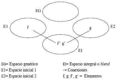 Tal configuración de espacios constituye una red o plataforma de integración conceptual, articulada de dos espacios iniciales o de entrada (E1, E2), un espacio genérico (EG) y un espacio integral (p. ej.: EI o blend). Cada uno de estos diferentes tipos de espacios posee una función cognitiva específica en la red (Fauconnier, 1997 y Fauconnier y Turner, 1998).