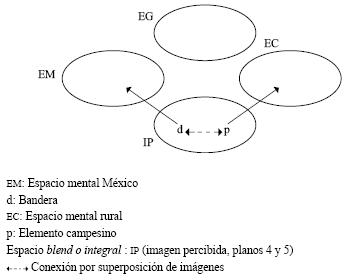 Para esta modelización, el elemento bandera permite el desempaquetaje del espacio mental México (EM),19 mientras que el elemento "campesino" introduce el espacio "rural" (EC). Dada la superposición de imágenes, el elemento campesino (p) estará conectado () no solamente a la bandera (d), sino, sobre todo al país al cual esta representa. En tales condiciones, el personaje en cuestión encarnará al país, a sus instituciones, a su territorio, a su cultura, etcétera. Es la función de conexión personaje=México. Ella permitirá, eventualmente, que los espectadores desplieguen lecturas metafóricas de las escenas, de las cuales ulteriormente proporcionaremos algunos ejemplos (infra).
