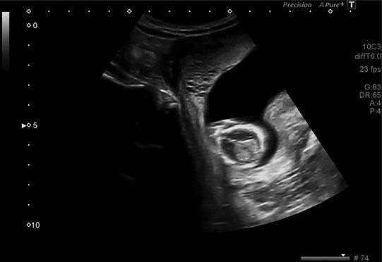 Figura 1 Ecografía de las 12 semanas; revela una imagen que mide 14 x 20 mm y múltiples imágenes anecoicas en su interior.