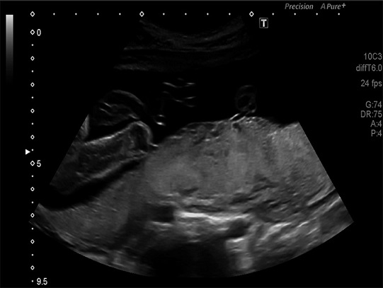 Figura 2 Ecografía de las 20 semanas de gestación; queda de manifiesto el área de ecogenicidad mixta con diámetro de 20 x 40 mm.