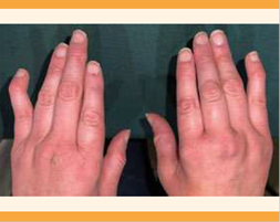 Figura 1 En la exploración física se advierte la deformidad en cuello de cisne en los meñiques de ambas manos con hiperextensión de las articulaciones interfalángicas proximales y flexión de las interfalángicas distales.