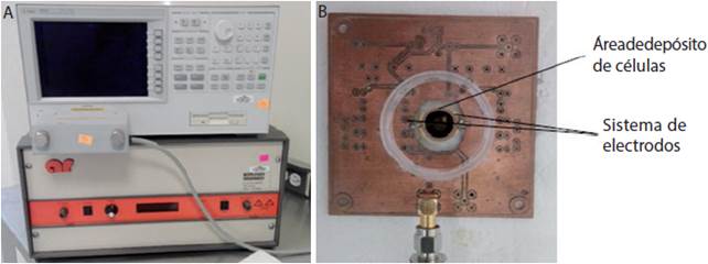 Figura 1 Sistema de análisis de espectrosco pia de impedancia eléctrica: A. es pectrómetro de impedancia de alta precisión (Agilent; Modelo4294A), B. biosensor constituido por un sistema de electrodos, una base de cuarzo y un área de depósito de células.