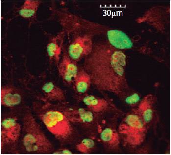 Figura 5 Microfotografía de células obtenidas de muestras de orina marcadas con el anticuerpo monoclonalanti-SSEA-4FITC. Marcaje de núcleos con DAPI. Aumento: 25x (microscopio multifotónico).