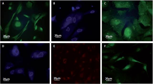 Figura 6 Microfotografías obtenidas en microscopiode epifluorescencia, donde se muestran los resultados de la fluorescencia de los marcadores de superficie relacionados con el fenotipo de células madre multipotenciales obtenidas de orina. A. CD44, B. podocalixina, C. CD73, D. CD90, E. SSEA-4y F. CD146.
