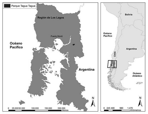El área de estudio fue el parque privado Tagua Tagua en la provincia de Llanquihue en la Región de Los Lagos, Chile, (41°43’15’’ S 72° 09’ 32’’ O) a una altura entre 100 m y 1600 m snm aproximadamente (Fig. 1).