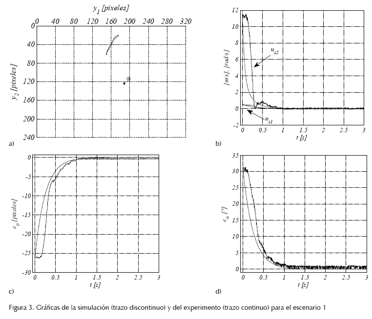 La figura 3 muestra las gráficas comparativas entre lo simulado y lo experimentado para el escenario 1. La figura 3a presenta, en el plano de imagen, yal mediante un círculo, ybl a través de un punto (ambas correspondientes al robot líder que no se mueve con una orientación de 43.31°, figura 2) y la traza del movimiento de yas, de manera que puede apreciarse (en el experimento) que conforme avanza el robot seguidor yas se mueve de yas(0) = [176.7 20.0]T [píxeles] hasta yas(3) = [149.6 62.1]T [píxeles]. Esto corresponde a una ρ(3) ≈ 70.3 [píxeles] y a una α(3) ≈ 89.4°, valores muy cercanos a los deseados (en la simulación los errores son prácticamente nulos). Las figuras 3b, 3c y 3d ilustran la evolución contra el tiempo de las señales de control del robot seguidor, de la señal de error eρ y de la señal de error eα, respectivamente. Como puede notarse, el desempeño es muy satisfactorio y las gráficas comparativas entre lo simulado y lo experimentado son muy similares.