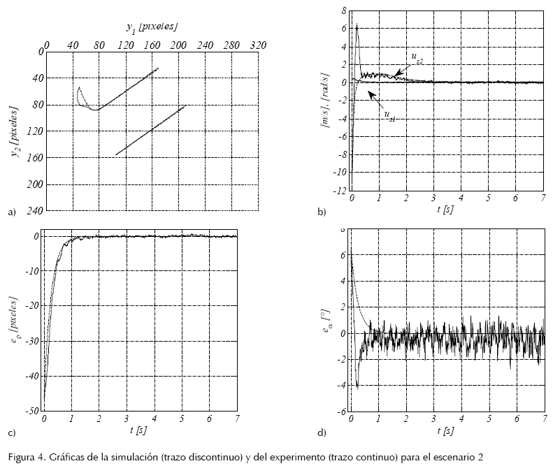 La figura 4a describe la traza, del experimento y de lo simulado, en el plano de imagen de la evolución tanto de yas como de yal; en el experimento yas parte de yas(0) = [51.1 56.4]T [píxeles] y termina en yas(7) = [169.5 24.0]T [píxeles] en tanto que yal inicia en yal(0) = [105.1 155.6]T [píxeles] y termina en yal(7) = [210.5 81.0]T. Esto corresponde a una ρ(7) ≈ 70.1 [píxeles] y a una α(7) ≈ 90.5°, los cuales son valores bastante aproximados a los deseados (nuevamente, en la simulación los errores son prácticamente nulos). Cabe destacar que el desempeño experimental es bastante satisfactorio y muy similar a lo simulado. Sin embargo, nótese que existen pequeñas diferencias entre lo simulado y lo experimentado en las trazas de yal (que corresponden al robot líder); lo anterior se debe a que el robot líder se mueve en lazo abierto y no se compensan las posibles perturbaciones presentes (derrapes, deslizamientos o desperfectos en el camino no modelados). También hay diferencias, al inicio del experimento respecto a lo simulado, en la traza de yas, las cuales también se deben a los posibles derrapes, deslizamientos y desperfectos en el camino, pero que ahora sí están compensadas por el controlador. Lo anterior se puede ver en la figura 4b que gráfica la evolución respecto al tiempo de las señales de control y en donde se observa un sobreimpulso en la señal de control us2l para solventar dichas situaciones. Las figuras 4c y 4d ilustran la evolución contra el tiempo de los errores de formación. En forma general se puede decir que el desempeño del sistema robótico con el controlador visual propuesto es muy satisfactorio, resaltándose que las gráficas en comparación (experimentos con simulaciones) son muy similares.