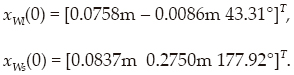 Estas condiciones iniciales corresponden a (en píxeles) yal(0) = [105.1 156.6]T, ybl(0) = [93.9 163.3]T, yas(0) = [51.1 56.4]T, ybs(0) = [39.4 49.6]T, ρ(0) = 112.9 y α(0) = 83.89°.