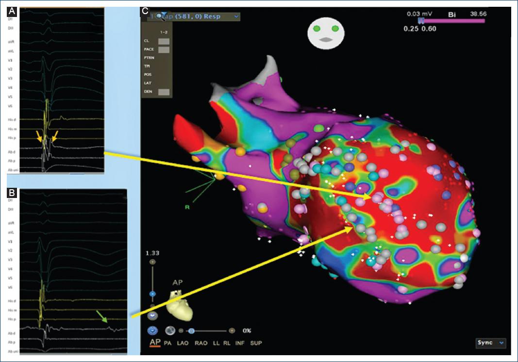 Se realizó estudio electrofisiológico con mapeo electroanatómico, se utilizó el sistema CARTO 3, los catéteres de diagnóstico (decapolar colocado seno coronario y cuadripolar en ventrículo derecho) se colocaron mediante introductores venosos. Mediante punción arterial con abordaje retrógrado se procedió al mapeo del ventrículo izquierdo con catéter de ablación Smartouch® (Biosense Webster). Se realizó mapeo por sustrato anatómico mediante la reconstrucción de un mapa bipolar, encontrando potenciales mesodiastólicos, dobles potenciales y fragmentados en la zona de la cicatriz (Fig. 2). Se realizó ablación guiada por sustrato tras la cual se llevó a cabo estimulación ventricular, hasta con cuatro extraestímulos, alcanzando el periodo refractario ventricular sin llegar a inducirse TV. Posteriormente se procedió al implante de desfibrilador, ya que no cumplía criterios eléctricos para el implante de resincronizador. Se mantuvo el tratamiento antiarrítmico con base en betabloqueante y amiodarona. El paciente fue egresado del hospital y tras dos años de seguimiento no presentó episodios de TV, la fracción de eyección se mantuvo deprimida en grado severo (FEVI 35%), sin eventos de descompensación que ameriten internación.