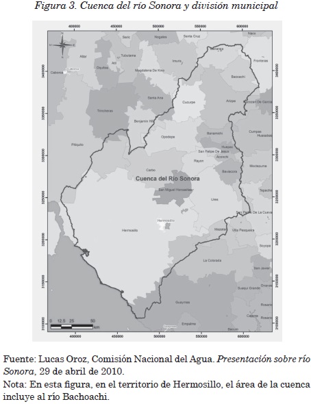 Otra vía de llegar a los derechos de agua de la cuenca del río Sonora es a través de la división municipal en la cuenca. De acuerdo con un estudio de la Comisión Estatal del Agua de Sonora (CEA Sonora), la cuenca del río Sonora se ubica enteramente dentro del estado de Sonora y comprende un total de veintisiete municipios. De estos, solo tres municipios están ubicados en su totalidad dentro de la cuenca; otros diez tienen la mayor parte de su territorio ubicada en la cuenca, mientras que otros catorce tienen solo una parte minoritaria de su territorio dentro de la cuenca (Comisión Estatal del Agua y Torynor, 2009).