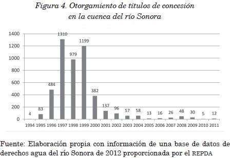 Un funcionario del Organismo de Cuenca del Noroeste en entrevista informó que el proceso de registro de los derechos de agua a partir de 1994 consistió -más bien- en el reconocimiento de los usuarios del recurso ya existentes y no fue, por lo tanto, un proceso de decisión con base en consideraciones de disponibilidad o conservación del recurso. Incluso el proceso fue lento, ya que tuvo que vencer muchas resistencias de los usuarios a proporcionar la información y a realizar los pagos correspondientes (Oroz, 2012a). De este modo, el otorgamiento de los títulos no fue un proceso que tuviera el control sobre el número de concesiones y donde hubiera solicitudes que pudieran no ser aceptadas. Más bien se trató de un proceso en el que la CONAGUA y el REPDA hicieron campaña de convencimiento a los usuarios para que registraran sus usos y aprovechamientos.