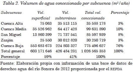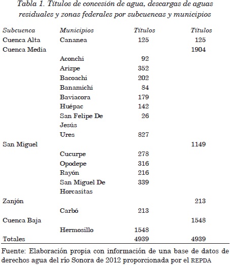 A través de la consulta a la página web del REPDA entre noviembre de 2011 y enero de 2012 se construyó una base de datos de los derechos concesionados en los 15 municipios de la cuenca del río Sonora. La base contiene un total de cuatro mil novecientos sesenta y cinco registros de títulos de concesión. Al revisar dicha base, se observa que veintiséis registros aparecen en blanco, es decir, no contienen ningún dato referente al volumen de agua concesionado, ni superficial ni subterráneo, y solo contienen el nombre del titular y la fecha de la concesión. Según la consulta realizada, estos registros en blanco corresponden a derechos obsoletos que no fueron renovados y ya no están vigentes. Restados los registros en blanco, la base de datos con información numérica consta de cuatro mil novecientos treinta y nueve registros, de los cuales cuatro mil cuatrocientos trece corresponden a concesiones de extracción de agua (superficial o subterránea), mientras que el resto se refieren a permisos de descarga de aguas residuales y zonas federales.