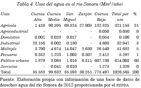 Al 31 de marzo de 2012, el REPDA tenía registrados un total de cuatrocientos cincuenta y siete mil ochocientos tres títulos de concesión en todo el país. De estos, veintiséis mil seiscientos ochenta y cinco (el 6%) corresponden al Organismo de Cuenca Noroeste (OCNO), en cuya jurisdicción se ubica la cuenca del río Sonora.