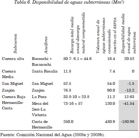 Por otra parte, en lo que respecta a las aguas subterráneas, únicamente hay disponibilidad de agua en la cuenca alta, en los acuíferos de los ríos Bacoachi y Bacanuchi, así como en el acuífero de la Poza, mientras que el acuífero de Santa Rosalía está en equilibrio. Sin embargo, los acuíferos de San Miguel, Zanjón, Mesa del Seri-La Victoria y Costa de Hermosillo no tienen disponibilidad y se encuentran en déficit; además, el que se encuentra en el estado más crítico es el de la Costa de Hermosillo, del que se extrae 70% más que la recarga.