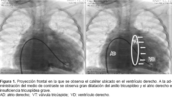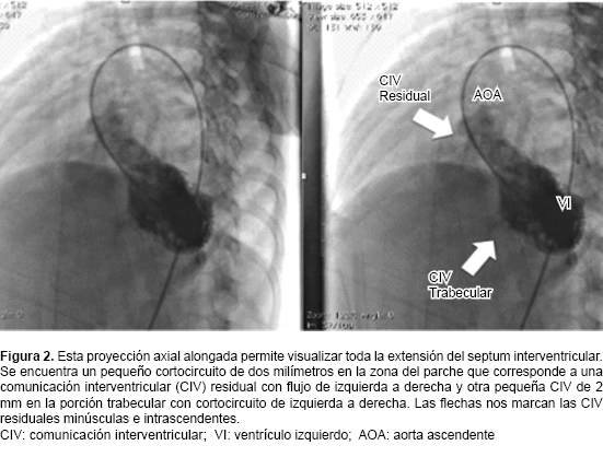 Posterior a la cirugía hubo un evento que puede ser considerado como una crisis hipertensiva. La niña tenía hipertensión arterial pulmonar y permaneció desaturada, por lo que fue necesario tratarla con ventilación mecánica y vasodilatadores pulmonares para que cediera la crisis. Cabe mencionar que, de ninguna manera, es un evento inusual, ya que es la causa más frecuente para esta complicación. Tal vez porque la CIV es una de las cardiopatías congénitas que se opera en el mundo con más frecuencia, aunque se ha descrito también en el canal atrioventricular completo, tronco arterioso, conexión anómala total de venas pulmonares o en la D-transposición de grandes arterias.3 Además de la hipertensión arterial pulmonar ya conocida, se describe un pinzamiento aórtico de poco más de una hora, que puede considerarse prolongado y que, cuando ambas condiciones se conjugan, se promueve la secreción de sustancias vasoconstrictoras, como el tromboxano, leucotrienos y otras antiinflamatorias que mantienen un estado de hipertensión. En este caso se resolvió con el manejo convencional a base de oxígeno y vasodilatadores. De hecho, en el ecocardiograma de control al alta de cuidados intensivos, se documentó una presión pulmonar de 42 mmHg. Ante esta evolución se puede inferir que la presión pulmonar elevada era reactiva, porque la resistencia vascular pulmonar no era fija. Durante la evolución postoperatoria se describe un cuadro de hepatitis A con anticuerpos positivos, pero que parece intrascendente en la historia clínica de esta paciente. Pero, lo que es totalmente anormal es que continuara con hepatomegalia y se mantiene aún después de la corrección de los defectos. Si bien la asociación de hepatomegalia con cardiomegalia nos habla de insuficiencia cardiaca, en este caso, una vez corregidas las lesiones cardiacas, la hepatomegalia debió desaparecer. Ante esta situación se decidió practicar un cateterismo cardiaco que reportó una resistencia vascular pulmonar normal -considerando como normal entre 2 y 4 uW- con presión pulmonar elevada y dos pequeñas comunicaciones interventriculares que ocasionaban un gasto pulmonar de 1.2 (que puede considerarse como muy poco significativo, ya que cuando es mayor de 1.5 los niños suelen ser sintomáticos). Un defecto estaba localizado en las márgenes del parche quirúrgico y otro, en el septum trabecular distante de dicho parche, pero realmente la patología estribaba en una grave insuficiencia tricuspídea.