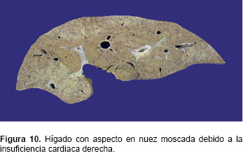 Un hallazgo, que es relativamente frecuente, es la presencia de material plástico en la luz de los vasos, que puede corresponder a fragmentos de catéter, acompañado de una célula gigante multinucleada tipo cuerpo extraño. El hígado mostró patrón en nuez moscada (Figura 10). Estaba aumentado de peso y tamaño (800 g para un peso referido de 680 g), debido a la congestión asociada con la insuficiencia cardiaca derecha. Histológicamente, los espacios porta no presentaron alteración, y no se encontraron datos de hepatitis A, que tenía diagnosticada dos años previos de acuerdo con la historia clínica. El bazo estaba aumentado de tamaño, congestivo, con datos de insuficiencia cardiaca derecha. De la misma manera, los riñones estaban aumentados de tamaño, con congestión intensa en corteza y médula. La pared de la vejiga mostró bandas de contracción. Los vasos del cerebro estaban congestivos, aunque estructuralmente no se encontraron alteraciones. Histológicamente, algunas neuronas presentaron datos de hipoxia con citoplasma rojo intenso denso y núcleos hipercromáticos y condensados. Los diagnósticos anatómicos finales se enumeran en el Cuadro 2.