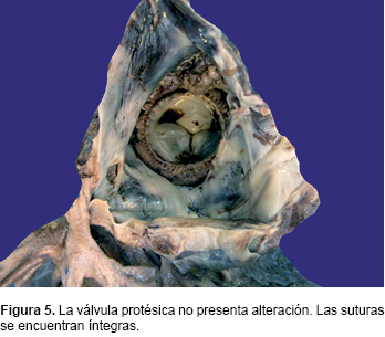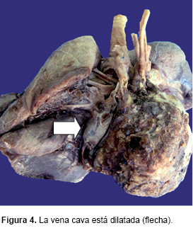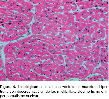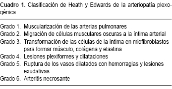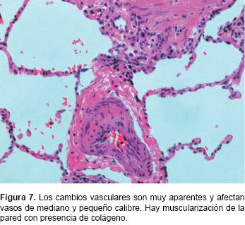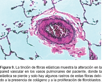 Los datos de somatometría del estudio post mortem revelaron desnutrición crónica acentuada con peso de 14.9 kg, para un esperado de 22 kg. La talla fue de 104 cm, con referencia para su edad de 117 cm. En el tórax anterior, sobre la línea media esternal, se observó una herida suturada de 12.5 cm de longitud. Al abrir la cavidad torácica, la cavidad pleural derecha contenía 10 cc de líquido serohemático; la cavidad izquierda contenía 20 cc de líquido con las mismas características. Del mediastino se retiró un hematoma de 4 x 3 cm. El pericardio (Figura 3) mostraba múltiples adherencias y coágulos sanguíneos. En este estudio, el órgano principal es el corazón, que se encontró aumentado de tamaño y peso. El bloque cardiopulmonar pesó 450 g, con referencia de 343 g. Las aurículas se encontraron dilatadas. En la vista posterior del corazón se puede observar la vena cava inferior muy dilatada (Figura 4). Por otra parte, la superficie de los pulmones es de color gris claro, excepto en las bases (que es de un color rojizo). En la base del pulmón derecho observamos dos ampollas que no representaron mayor alteración. La aorta y tráquea no mostraron cambios. El corte del corazón reveló la válvula protésica aurículo-ventricular derecha, de 2.5 cm de diámetro (Figura 5). Ambos ventrículos estaban hipertróficos; el derecho, además, estaba dilatado, y había una comunicación interventricular infundibular de 0.1 cm. El conducto arterioso estaba ocluido quirúrgicamente. Histológicamente, los ventrículos mostraron hipertrofia, con leve desorganización de las cardiomiofibrillas, los núcleos eran hipercromáticos y con variación en su forma (Figura 6). La cardiopatía motivó los cambios observados en los pulmones, con espacios alveolares con macrófagos con hemosiderina y que representan eventos repetidos de edema y hemorragia, y cambios menos aparentes en los lóbulos superiores, asociados a insuficiencia cardiaca de lado izquierdo. Muy notable es el daño vascular, donde se observan las paredes de los vasos engrosadas debido a la hipertensión pulmonar. También se observaron cambios más aparentes en los vasos pequeños y medianos, con muscularización de la pared (Figura 7), hallazgos que no son uniformes en todos los vasos. El daño es más acentuado en otros campos, con proliferación de fibroblastos, muscularización y proliferación de la íntima en disposición concéntrica (Figura 8). En todos los vasos estudiados, no se encontraron lesiones plexiformes ni necrosis en su pared. Con la tinción de fibras elásticas fue posible hacer evidente el daño a la pared vascular (Figura 9). Estos cambios se integran en el grado III de la clasificación de Heath y Edwards (Cuadro 1), con cambios en diferentes estadios en los diferentes vasos.