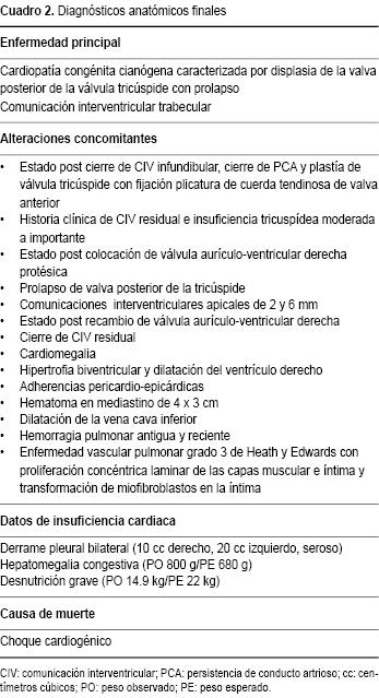 Finalmente, ante la condición de esta niña con insuficiencia tricuspídea grave, era obligado someterla a un reemplazo valvular tricuspídeo. Sin embargo, el advenimiento postquirúrgico era predecible ante la presencia de un ventrículo derecho disfuncional durante años. Mis diagnósticos finales son el de una insuficiencia tricuspídea grave que condicionó disfunción ventricular derecha, hipertensión arterial pulmonar moderada residual con resistencias vasculares pulmonares bajas sin evidencia de enfermedad vascular pulmonar y dos comunicaciones interventriculares minúsculas, una residual y otra congénita, sin repercusión clínica.