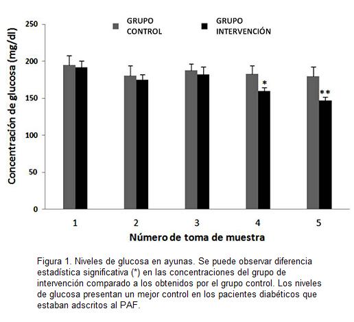 Para evaluar el impacto del PAF en el control metabólico de los pacientes diabéticos, se midieron de primera instancia los niveles de glucosa en ayunas. Al comienzo del estudio se realizó la medición y comparación de los niveles de glicemia entre los pacientes del grupo de intervención y del grupo control, se observó que no habían diferencias estadísticamente significativas (p=0.336). Demostrando así que los grupos eran homogéneos al inicio del estudio.