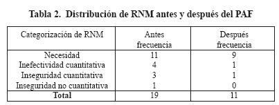 En la Tabla 2 se muestran la distribución de los RNM identificados antes y después del PAF, como se puede apreciar en ambos momentos el RNM con mayor frecuencia fue el de Necesidad por un problema de salud no tratado; donde el paciente sufre un problema de salud asociado a no recibir una medicación que necesita. En relación a los 11 RNM antes del PAF correspondieron a pacientes que a pesar de estar diagnosticados como diabéticos no contaban con la medicación para tratar su enfermedad, se intervino mediante la comunicación con el médico tratante a fin de modificar la estrategia farmacológica (añadir un medicamento), sin embargo solo se resolvieron 2 casos al final de PAF. Respecto a los RNM de inefectividad cuantitativa e inseguridad cuantitativa pudiesen estar relacionados con la no adherencia al tratamiento farmacológico o por un uso inadecuado de la farmacoterapia, para ello se realizó la intervención mediante ES y se observó la disminución de ambos RNM, finalmente para el caso de inseguridad no cuantitativa, se resolvió mediante la comunicación con el médico tratante y la modificación de la estrategia farmacológica.