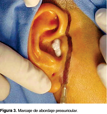 1. El abordaje preauricular. Se realiza ubicando el punto pina de la oreja y se desliza hacia abajo muy cerca del cartílago auricular hasta llegar al punto más inferior del lóbulo de la oreja dando una apariencia en alas de gaviota.