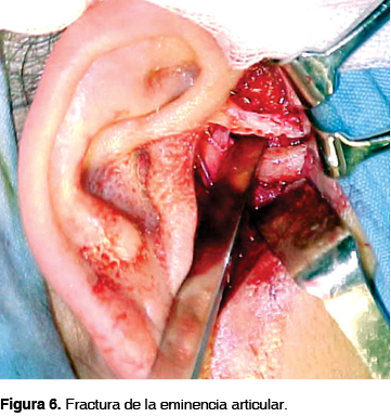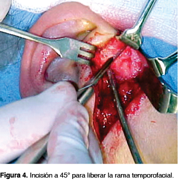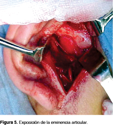 Una vez hecha la asepsia y antisepsia de la zona preauricular (Figura 3), se realiza abordaje preuricular, incidiendo piel y tejido celular subcutáneo hasta alcanzar la fascia superficial del temporal, palpando el arco cigomático, se realiza una incisión a 45° con respecto a este para liberar la rama temporofrontal del nervio facial (Figura 4), se realiza disección cuidadosa de la fascia superficial del temporal y de la cápsula hasta descubrir la cavidad glenoidea, la eminencia articular y el 1/3 posterior del arco cigomático (Figura 5).