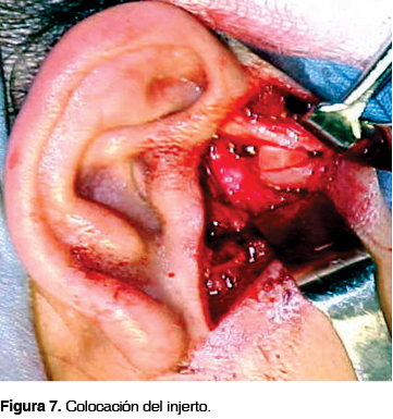Posteriormente se procede a trazar con fresa la osteotomía oblicua desde el arco cigomático cruzando la eminencia articular. Con un cincel fino se realiza la fractura en rama verde y el descenso de la parte inferior de la eminencia (Figura 6). Se toma el injerto y se le da forma de cuña y se interpone entre los fragmentos osteotomizados (Figura 7). Posteriormente se procede a fijar el injerto mediante una placa de 3 orificios y tornillos de 2.0 por 5 mm colocando un tornillo en la parte inferior de la eminencia, otro en el injerto y otro en la parte superior de la eminencia (Figura 8). Una vez fijo el injerto se procede a suturar por planos y se da por terminada la cirugía.