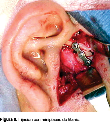 La fijación del injerto mediante miniplacas y tornillos de titanio permite dejar un injerto rígido sin capacidad de extrusión o movimiento, reduciendo las posibilidades de que el tratamiento quirúrgico fracase evitando la salida del cóndilo por el aspecto medial de la osteotomía.