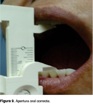 Se cita al paciente a revisión a la semana, 15, 21 y 30 días, y posteriormente en forma mensual hasta los 6 meses, después a los 12 meses y por último a los 18 meses. Se evaluó apertura bucal (Figura 9), la traslación del cóndilo dentro de la cavidad glenoidea, mediante tomografía lineal (Figura 10), presencia de ruidos articulares anormales y sintomatología dolorosa, para posteriormente analizar estos mismos datos con los previos a la cirugía.