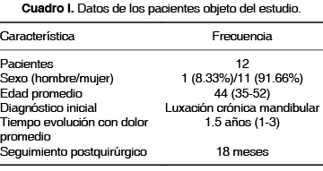El presente estudio se realizó en el Hospital Regional 1o de Octubre (ISSSTE). Doce pacientes fueron intervenidos quirúrgicamente en el 2006, 1 masculino y 11 femeninos, con una edad promedio de 44 años (35-52) a quienes se les diagnosticó clínica y radiográficamente (tomografía lineal) luxación crónica mandibular (por lo menos 3 eventos previos), con sintomatología dolorosa mayor o igual a 8 en la escala visual análoga (EVA), evolución de 1.5 años en promedio (1-3), y una apertura bucal de 55 mm o mayor a ésta, tratados en forma conservadora durante por lo menos tres meses a base de ejercicios de reprogramación muscular, terapia física, colocación de elásticos clase III, aplicación de toxina botulínica en músculo pterigoideo externo sin éxito (Cuadro I).