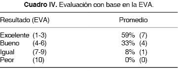 Para valorar la mejoría de la sintomatología en base a la EVA y en relación a la sintomatología previa a la cirugía se definió como un resultado excelente cuando la EVA estaba entre 1 y 3; bueno entre 4 y 6; igual entre 7 y 9; peor 10. El 59% de los pacientes (7 pacientes) presentó excelentes resultados, el 33% (4 pacientes) buenos resultados y sólo el 8% (1 paciente) permaneció igual. Ningún paciente presentó un grado mayor en la EVA al referido previamente a la cirugía (Cuadro IV).