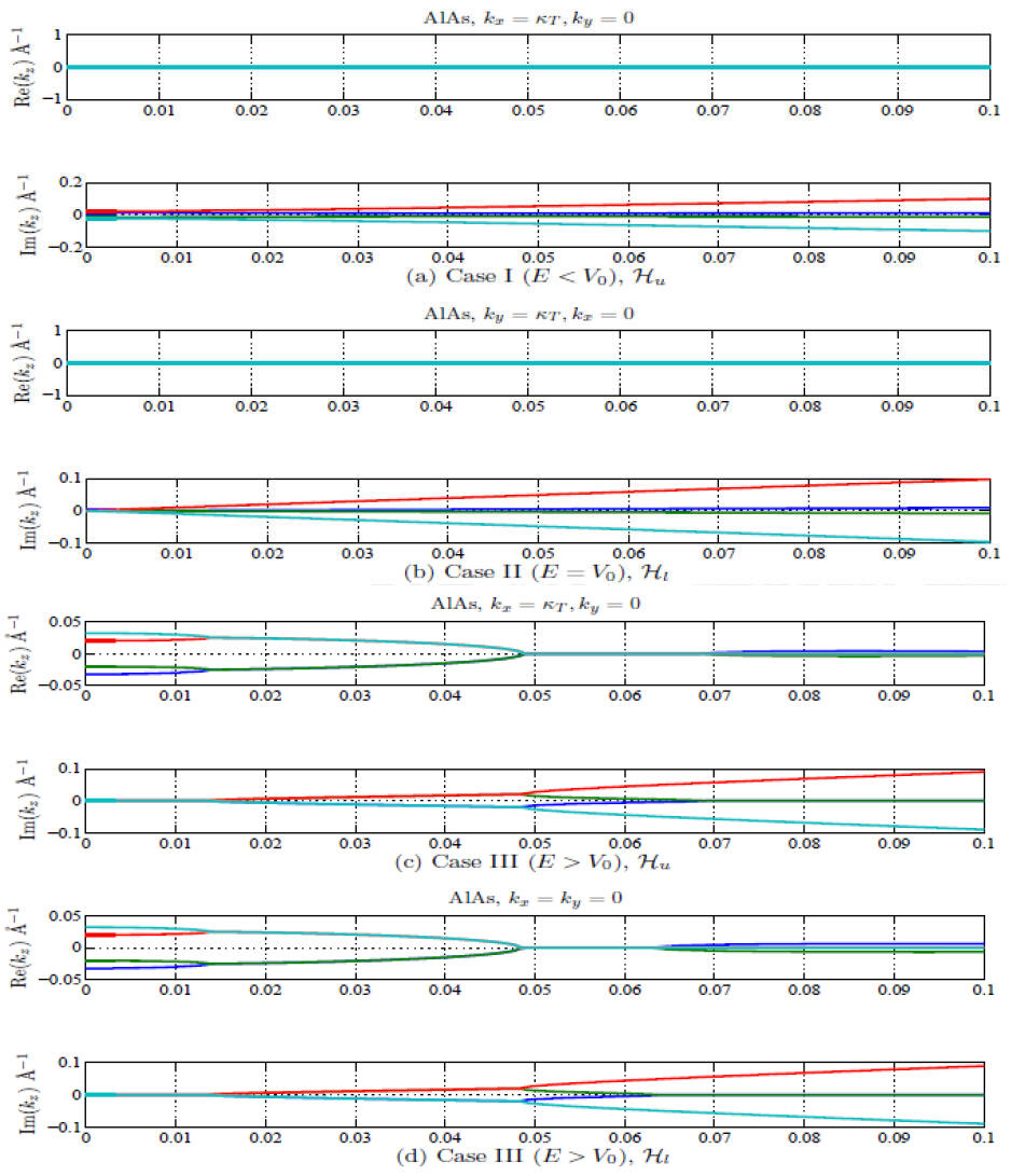 Although not shown here the (2×2) KL's model owing to brevity, we have observed no differences between the cases where E < V0 and E ∼ V0 in comparison to the results obtained from the (4 × 4) KL's model Hamiltonian, which guaranteed its standard barrier properties. Nevertheless, in the case where E > V0 , both the heavy (hh) and the light holes (lh) presented a quantum well (QW ) in the [0.0, 13] interval because their eigenvalues were real; while heavy (hh) and light holes (lh) simultaneously experienced an attractive and repelling energy in the [0.13, 0.49] interval, since their eigenvalues were complex- real part and imaginary part. It the [0.49, 0.64] interval, both light (lh) and the heavy holes (hh) experienced a barrier; finally in the [0.64, 1] interval light holes (lh) experienced a quantum well, while heavy holes (hh) presented a barrier. The results were the same independently of the use of Hu or Hl Hamiltonians respectively.