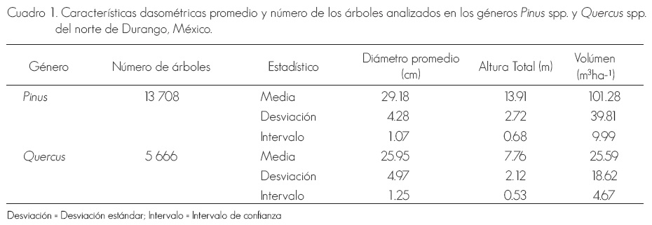 La evaluación de los componentes de biomasa aérea es un procedimiento que implica derribo; por tal motivo se diseñó un muestreo dirigido, basado en la presencia de arbolado dentro de las clases dasométricas de los predios. Las mediciones se hicieron en ejemplares procedentes de los aprovechamientos autorizados en los programas de manejo forestal vigentes, lo que permitió obtener la información necesaria sin provocar impactos adicionales a los ecosistemas del área. Se eligieron los árboles que reunían características diamétricas representativas de los sitios, encontrando las siguientes especies: P. durangensis, P. arizonica, P. leiophylla Schiede & Deppe, P. teocote, Pinus engelmannii Carrière, P. cooperi Blanco, Quercus sideroxylla y Quercus rugosa. El número de árboles seleccionados del inventario de los tres ejidos y sus características dasométricas se muestran en el Cuadro 1.