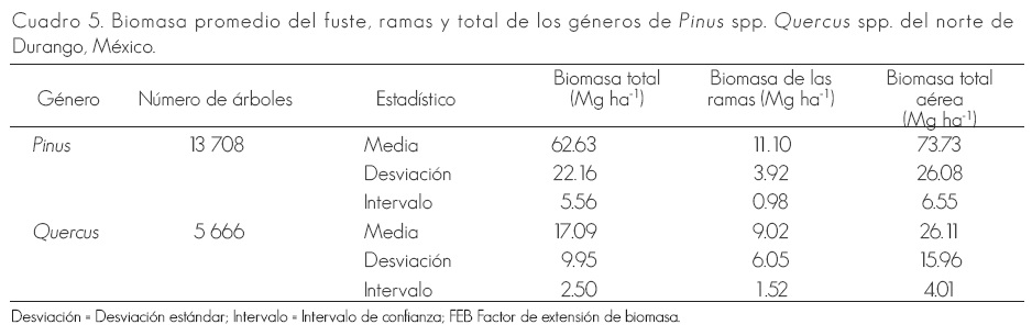 El valor promedio encontrado de la biomasa fustal, de ramas y total en los géneros Pinus spp. y Quercus spp. del norte de Durango, México, con el uso de las ecuaciones alométricas se presenta en el Cuadro 5.
