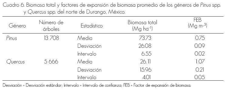 Los valores de FEB estimados con las ecuaciones alométricas para Pinus spp. y Quercus spp. del norte de Durango, México se reúnen en el Cuadro 6.