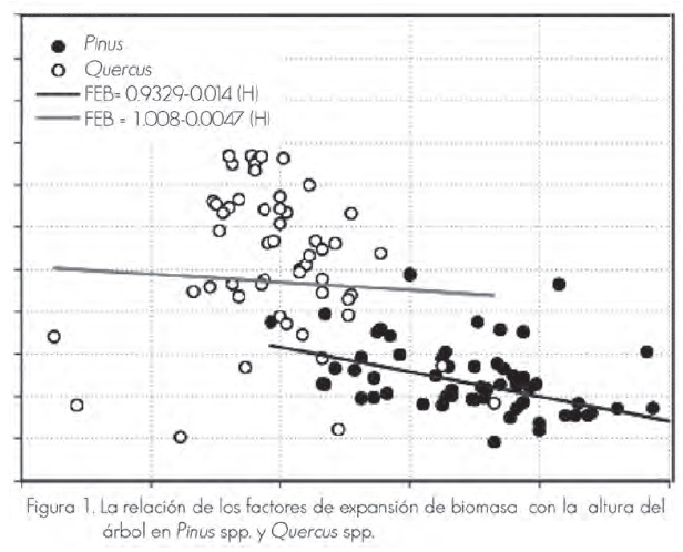 Esta información es compatible con los resultados citados por Gracia et al. (2004), quienes indican la misma variación de los FEB con respecto a la altura y mencionan que los FEB son dependientes del tamaño de los árboles. Esto se corrobora en otros estudios en los que los factores de expansión de biomasa están en función de la altura, del diámetro, de la edad, del área basal, de la productividad, de la calidad del bosque y de la composición de especies (Brown et al., 1989; Fang et al., 2001; Snaudon et al., 2000; Loguercio y Defossé, 2001;Návar-Chaidez, 2009).