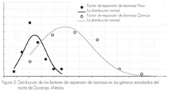Los FEB de las especies estudiadas de pino y encino se distribuyen de forma normal (P ≥X 2 = 0.58 y P ≥X 2 = 0.097) (Figura 3).