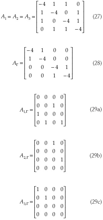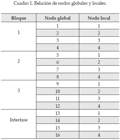 En el cuadro 1 se observa que cada bloque y la interfaz están formados por cuatro nodos, por ello las matrices Ai y AΓ son en este caso de 4 × 4. Una vez que se tienen las matrices como se indican en (27) a (29), se procede a calcular las matrices S y