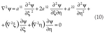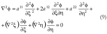 En Thompson et al. (1985) se explica la transformación de la ecuación de Laplace de coordenadas cartesianas a curvilíneas, que parte de las relaciones como la indicada en (4). Las ecuaciones (2) y (3) quedan expresadas en su forma curvilínea no conservativa, respectivamente como:
