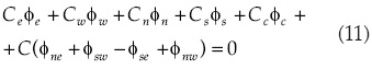 , por lo que ∇2ξ = ∇2η = 0, y, como es costumbre en la malla curvilínea, se tiene ∇ξ = ∇η = 1. Al aplicar los coeficientes definidos por (12), para el nodo 1 se tiene que Φc = Φ1, Φe = Φ2 y Φn= Φ3 que sustituidos en (11) da por resultado: