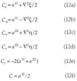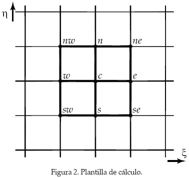 Las ecuaciones (9) y (10) son resueltas con un esquema de diferencias finitas centradas (Leveque, 2007). Teniendo en cuenta que en el plano curvilíneo Δξ = 1 y Δη = 1, y sustituyendo el esquema de diferencias, (9) se expresa como sigue: