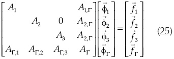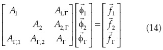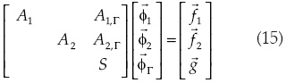Los componentes involucrados en (14) son vectores y matrices; A1 y A2 son las matrices resultantes de las discretizaciones en los subdominios Ω1 y Ω2, mientras que la matriz AΓ corresponde a la discretización de la interfaz Γ. Las matrices Ai,Γ y AΓ,i establecen la interacción entre la interfaz y los subdominios. Finalmente, los vectores