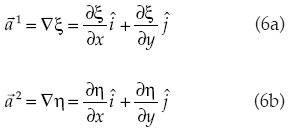 La derivada respecto a y se calcula de manera semejante. Para evaluar estas derivadas se requiere conocer ∂(ξ,η)/∂(x,y), que se obtienen a partir del sistema coordenado curvilíneo. La base covariante del sistema curvilíneo se define como:
