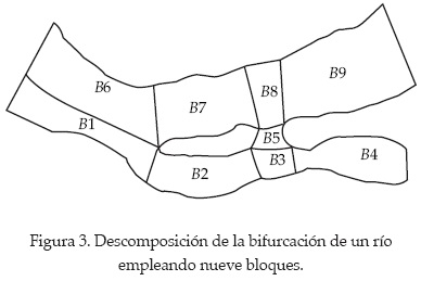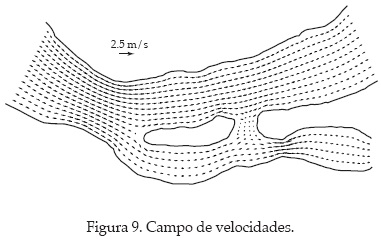 Se estudia la bifurcación del río Mezcalapa en los ríos Samaria y Carrizal; en este caso se calculó el campo de velocidades y la distribución de gastos en los dos ríos de salida. La malla se indica en figura 8 y está conformada por 1 040 nodos. En la entrada del río Mezcalapa el potencial de velocidad se estableció como Φ = 4 000 m2/s, y en las salidas de los ríos Samaria y Carrizal como Φ = 0 m2/s. Por otra parte, las márgenes de los ríos se manejaron como fronteras tipo Newmann, esto es, ∂Φ/ ∂n = 0.